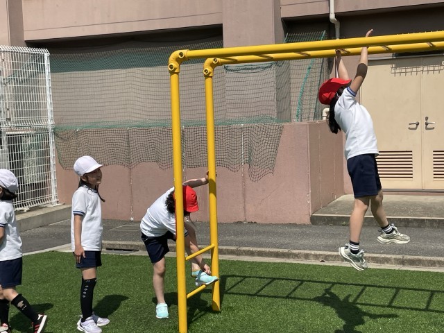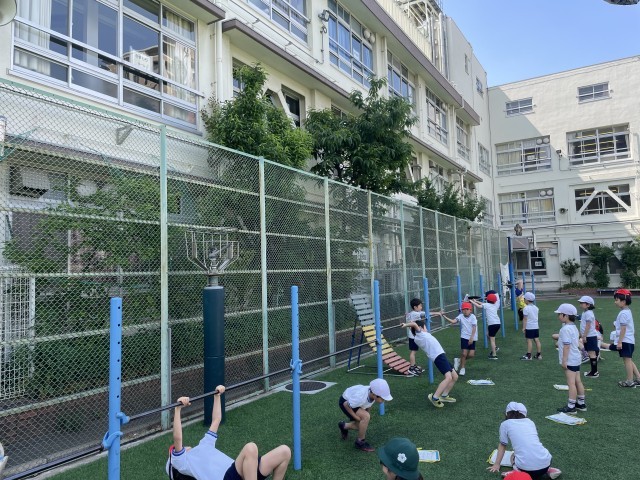 5時間目の体育は校庭です。はじめに運動場のトラックを1周します。走りたい人は3周も走っていました。子どもたちの体力にはびっくりします。水飲みをした後は、固定施設を使用した運動です。のぼり棒、ジャングルジム、雲梯、鉄棒など自分の苦手な活動、好きな活動など色々な活動に取り組みました。