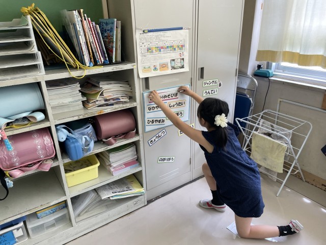 長さについて学習しています。定規がないときに長さを比べる方法として同じ長さのテープを1つ分と考え、その数で比べました。今日は方眼紙を用いて、消しゴムや筆箱、黒板など色々な長さを測りました。方眼紙の1マス分を1つとして測りました。