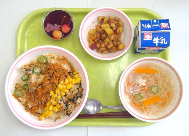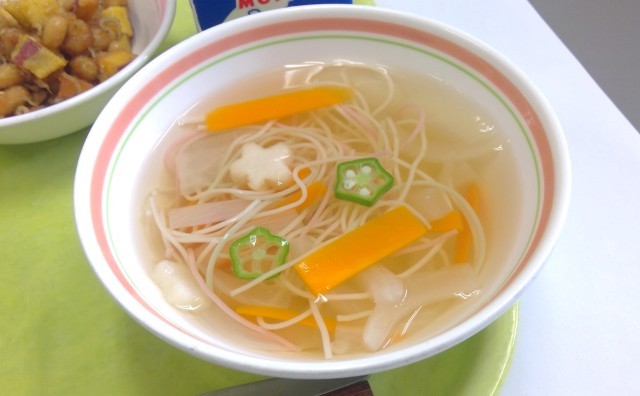 今日は彦星と織姫の2人が年に一度だけ、天の川で会える日です。給食では天の川をご飯、七夕の願い事を書いた短冊を七夕汁で再現しました。調理員さんが人参を短冊の形に上手に切ってくださいました♪