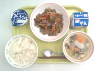 ・ご飯・豚ロースのスタミナ炒め・海藻スープ・りんごゼリー・牛乳