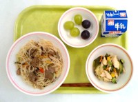 ・焼きビーフン・わかめサラダ・ぶどうの食べ比べ・牛乳