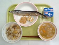 ★重陽の節句給食★・栗ときのこの炊き込みご飯・さんまの塩焼き・大根おろし&かぼす...