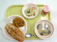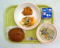 ・チョコチップパン・タンドリーチキン(野菜のグリル添え)・クリーミースープ・牛乳
