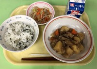 牛乳じゃこ入りふりかけご飯肉どうふこまつなの和えもの