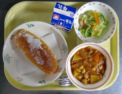 シュガー揚げパン カントリーサラダ チキンビーンズシチュー 牛乳