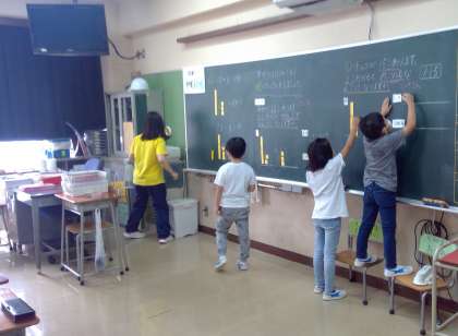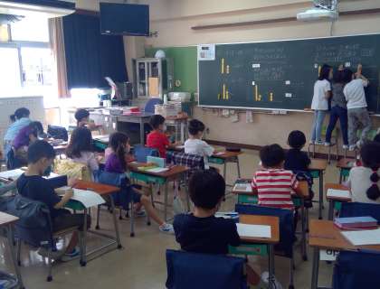 1年生の算数の授業の様子です。たし算とひき算の学習をしていました。一人一人が机上でブロックを使って操作をしながら問題を解いた後、代表児童が黒板で発表をしていました。