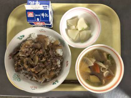 【ワンダフル給食献立】 ・ワンダフル牛丼 ・さつま芋のみそ汁 ・かぶの浅漬け ・牛乳