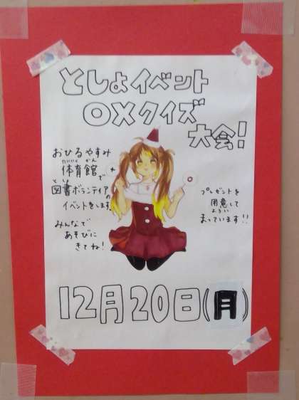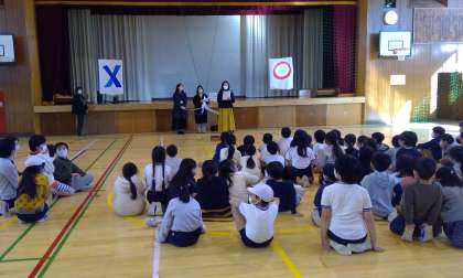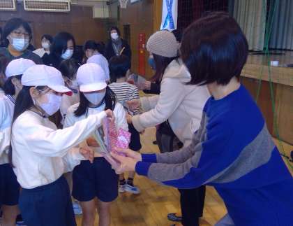 図書ボランティアの皆さんによる「としょイベント 〇×クイズ大会」が昼休みにありました。本にかかわる内容のクイズを〇×の問題にして出題していました。体育館には、1〜6年生がたくさん集まり、クイズを楽しんでいました。全問正解者には、素敵なしおりがプレゼントされました。間違えてしまった子供たちにも、参加証がありました。素敵な企画をありがとうございました。
