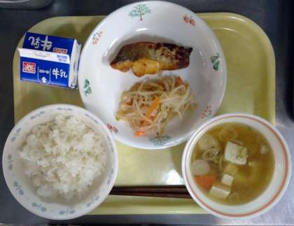 ごはん 野菜のすまし汁 魚のみそ焼き こんにゃくサラダ 牛乳