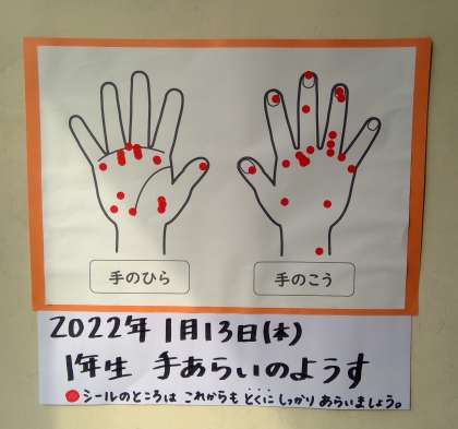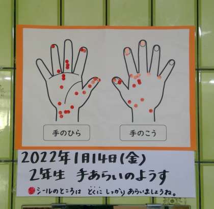 1月の「すこやか」保健指導では、低学年に向けて手洗い指導を行いました。「手洗いチェッカー(ブラックライト)」を使用することで、洗い残しを確認することができます。洗い残しがあった部分にシールを張っていくと、丁寧に洗う必要がある場所が分かりました。今後の手洗いの際の参考になりました。