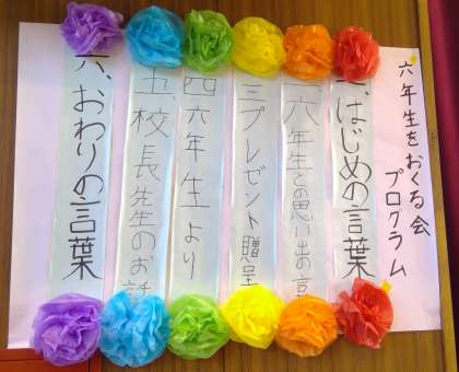 2月24日3・4校時に6年生を送る会を行いました。1〜5年生はそれぞれの出し物で6年生への感謝の気持ちを伝えました。どの学年も心のこもった素敵な出し物でした。6年生は、お礼の演奏と言葉を伝えました。素晴らしい演奏と立派な態度でのあいさつでした。毎年、この時間は、心がほっこり温かな気持ちになります。