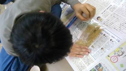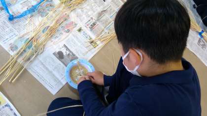 5年生の総合の授業の様子です。バケツで育てた稲が立派に実り、干していた稲の脱穀・籾摺り作業を行っていました。一人一人が自分で考えて用意した道具を使って、黙々と取り組んでいました。大変な作業でしたが、お米一粒一粒を無駄にしないように、丁寧に進めていました。