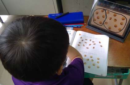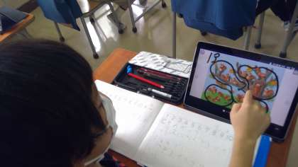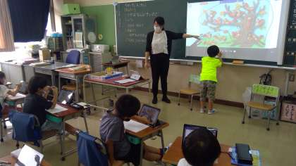 1年生の算数の授業の様子です。「10より大きな数」の学習をしていました。りすやドングリがいくつあるか、工夫をしながら数えていました。タブレット端末を使うと、いろいろな数え方を繰り返し試すことができます。最終的には、10のまとまりといくつと数えるとよいと確認していました。