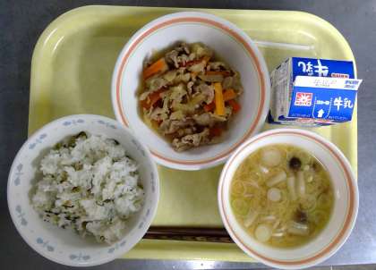 今日の給食の「野沢菜ごはん」は、野沢菜をごま油で炒め、しょうゆと塩で味付けしたものを、ごはんと混ぜ合わせてつくりました。