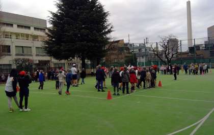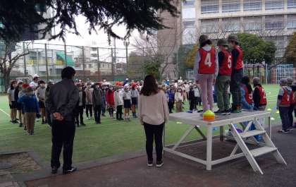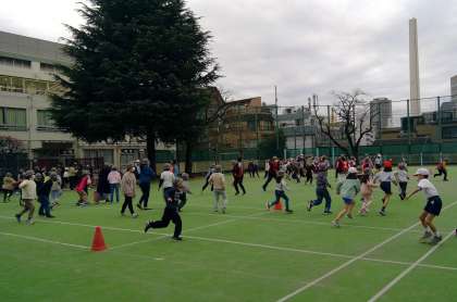 集会委員会企画の児童集会がありました。今回は、「サメ鬼」をしました。校庭を海に例え、鬼であるサメにつかまらないように逃げます。2つある筏の場所に入っている時はつかまりませんが、「筏が沈むぞ〜」の合図では筏からでなければなりません。子供たちは校庭を思い切り走り回り、寒さが吹き飛んでいるようでした。