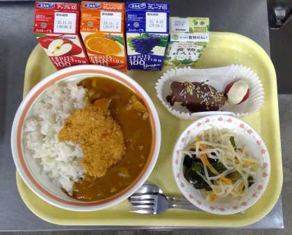 この給食は、6年生のみんなからアンケートをとり、人気の高かったものを参考に、「カツカレーライス」を選びました。また、アンケートの中に、「チョコバナナ」を食べてみたいという意見があり、新メニューとして考案しました。これは、バナナの上にコーティング用のチョコレートをかけ、さらに、カラフルなチョコスプレーをまぶしています。給食で出すものなので、お祭りの屋台のようにはいきませんが、楽しんで食べてもらえるとうれしいです。