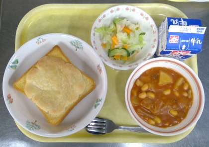 今日の給食では、食パンにバター・グラニュー糖・小麦粉を混ぜ合わせて作ったビスケット生地をのせ、オーブンで焼いて作りました。