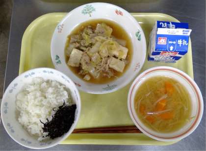 今日の給食では、牛肉ではなく豚肉を使用し、豆腐・白菜・えのき・しらたきと一緒に煮込み「すき焼き風」にしました。