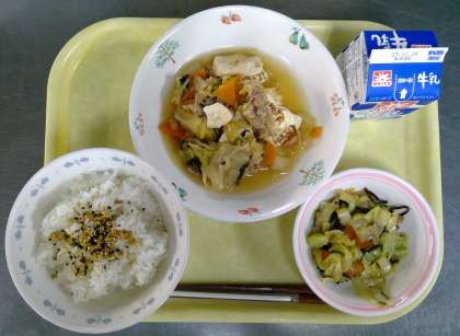 今日の給食では、キヌアとごまを乾煎りして、カレー風味に味付けをして「ふりかけ」にしました。