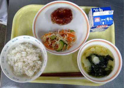 今日の給食では、ハンバーグをオーブンで焼いた後に、ケチャップとウスターソースを混ぜて作ったソースをかけました。ごはんや他のおかずとバランスよく食べましょう。