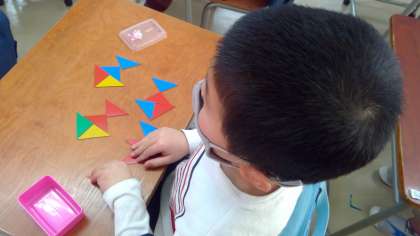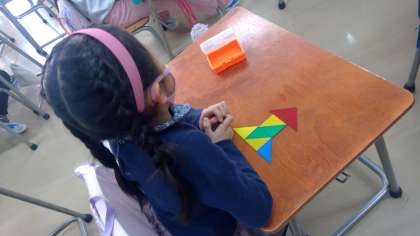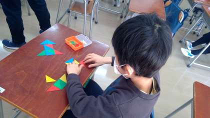 1年生の算数の授業の様子です。「かたち(2)」の学習をしていました。三角形の色板を並べて、いろいろな形を作っていました。ロケットや魚、ヨット、風車などが出来上がりました。