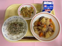 牛乳 じゃこ入りふりかけごはん肉じゃが揚げごぼうのサラダ