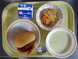 チキンカツバーガー じゃが芋のポタージュ オニオンサラダ 牛乳