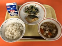 牛乳麦ご飯さばの文化干し磯和え豚汁