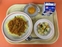 牛乳ドライカレーライスマセドアンサラダおかしな目玉焼き