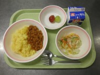 【献立】鉄骨ドライカレーライス、牛乳、じゃが芋入りサラダ、ぶどうの食べ比べ【きゅ...