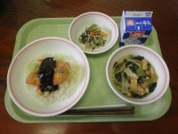 【献立】メダイのみそカツ丼、牛乳、きしめん汁、海苔のサラダ【きゅうしょくつうしん...