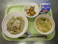 【献立】秋の香りご飯、牛乳、ビーフンの香味炒め、みそ汁、みかん【きゅうしょくつう...