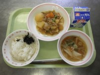 【献立】ご飯、牛乳、海苔の佃煮、韓国風肉じゃが、わんたんスープ【きゅうしょくつう...