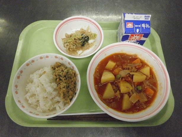 【献立】ご飯、牛乳、スタミナ納豆、トマト肉じゃが、ごまあえ