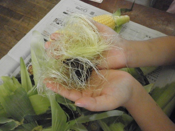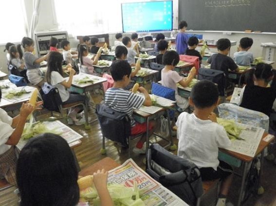 ★とうもろこしについて動画で学習した後、子供たちは「皮の色がだんだん白っぽくなっていく」、「本当に、粒の間からヒゲが出ている」、「ヒゲがふわふわして気持ちいい」など、とうもろこしの様子を観察しながら丁寧に、一生懸命取り組んでいました。給食時間、2年生以上の学年の教室では「1年生の時に皮むきしたね」と、自分たちも体験したことを思い出しながら味わう様子も見られました。
