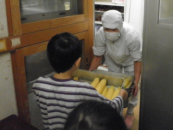 【きゅうしょくつうしん】とうもろこしは、夏の厚い季節に収穫される夏野菜の一つです。今日のとうもろこしは「ゴールドラッシュ」という品種です。東京の瑞穂町産です。昨日収穫されたものが、今朝届きました。全部で210本、1年生の皆さんが1本1本丁寧に皮むきをしました。よくかんで上手に食べましょう。