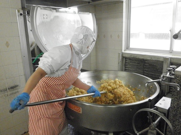 ★炒飯は、約200人分を一度に炒めてつくっています。食べるとあっという間の食べやすい料理ですが、調理は簡単ではありません。今日も暑いなか、力と心を込めてきれいに炒め、おいしく仕上げることができました。