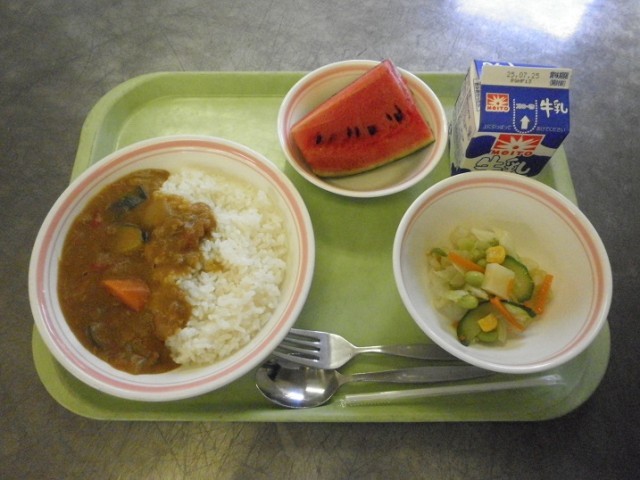【きゅうしょくつうしん】「夏野菜」と呼ばれている仲間の野菜は今が一番おいしい季節です。今日のカレーに入っている夏野菜は何でしょうか?かぼちゃとズッキーニ、なす、そしてトマトです。小玉すいかは茨城県産です。サラダには「つながる菜園」で収穫されたかぶが入っています。みなさんのサラダには入っているでしょうか?見つけられるでしょうか?いよいよ明日から夏休みですね。よくかんで味わって食べて、夏休みも元気に過ごしましょう。