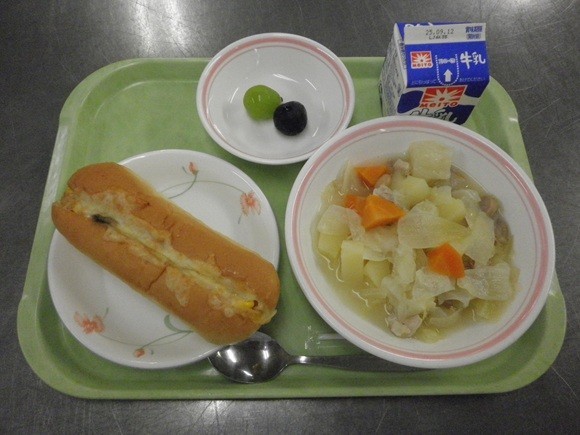 【献立】コーンマヨネーズドッグ、牛乳、ポトフ、ぶどうの食べ比べ