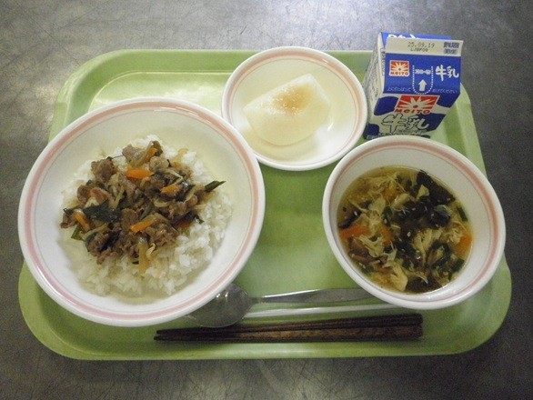 【献立】プルコギ丼、牛乳、丸ごとわかめスープ、梨