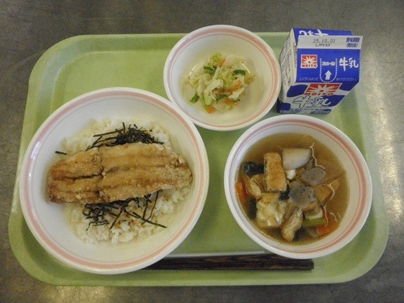 【献立】さんまのかば焼き丼、牛乳、けんちん汁、浅漬け