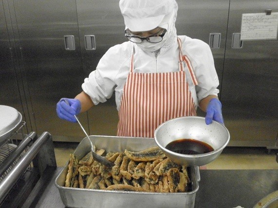 【きゅうしょくつうしん】「秋の味覚」の代表「さんま」。塩焼きにして食べたという人もいるでしょうか?今日は油でカラリと揚げて、甘辛のたれをからめたかば焼き丼です。小さな骨もありますが、よくかめば食べられると思います。よくかむと「さんま」のおいしさもよくわかります。味わって食べましょう。