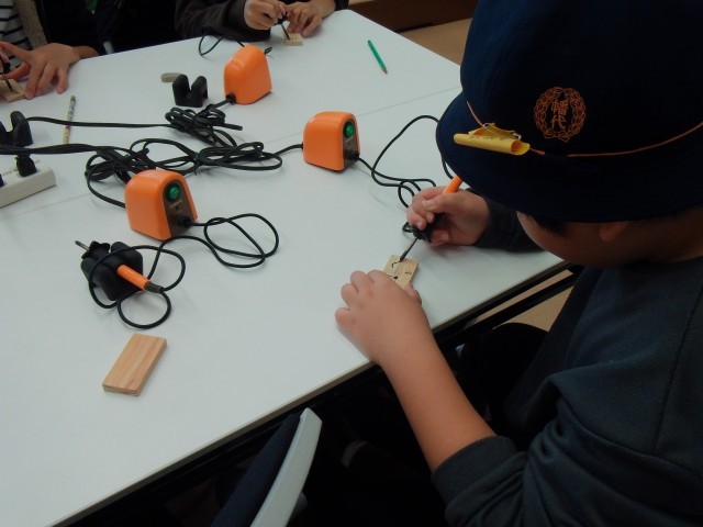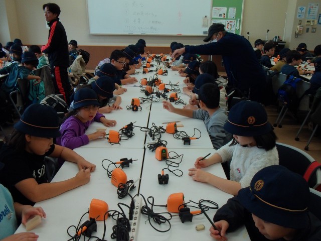 昨日は、たくさん体力を使ったこともあり、ぐっすり眠れた児童が多くいたようです。朝のつどいでは、鎌倉市と清水市の小学校と合同で、一日の活動を紹介し合ったり、ラジオ体操を行ったりしました。幡代小学校の3倍はある広い体育館では、25メートルの大縄跳びやスティックを使ったゲームを楽しみました。また、はんだごてとマーカーで作成する木製のストラップづくりにも挑戦しました。1泊2日の短い期間でしたが、子供たちには充実した楽しい時間となりました。