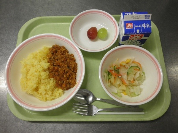 【献立】鉄骨ドライカレーライス、牛乳、じゃが芋入りサラダ、ぶどうの食べ比べ
