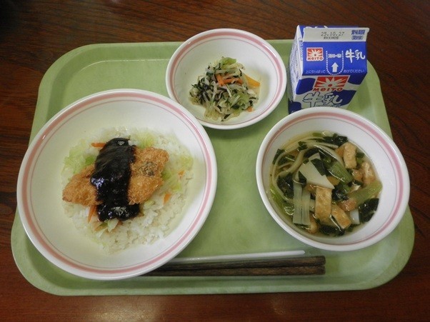 【献立】メダイのみそカツ丼、牛乳、きしめん汁、海苔のサラダ