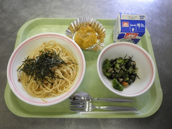 【献立】和風スパゲティ、牛乳、ひじきとブロッコリーのサラダ、もっちりスイートパンプキン