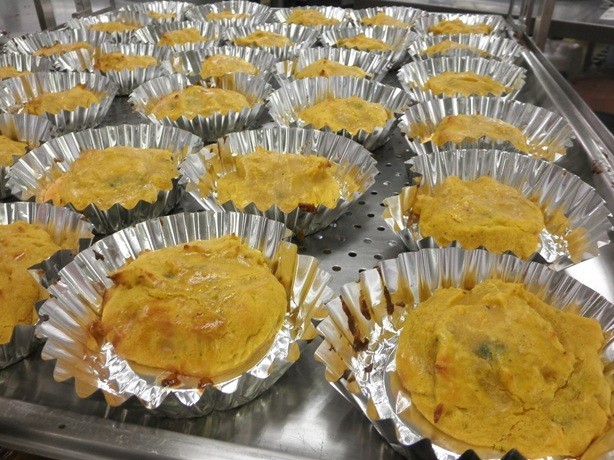 【きゅうしょくつうしん】今日の和風スパゲティ、いかがですか?海苔やバター、醤油の香りでおいしく食べられると思います。「もっちりスイートパンプキン」は、かぼちゃのデザートです。かぼちゃとさつま芋を蒸してつぶし、バターや生クリーム、いんげん豆のペーストなどを入れて、よく混ぜ合わせて形をつくり、オーブンで焼きました。味わって食べましょう。