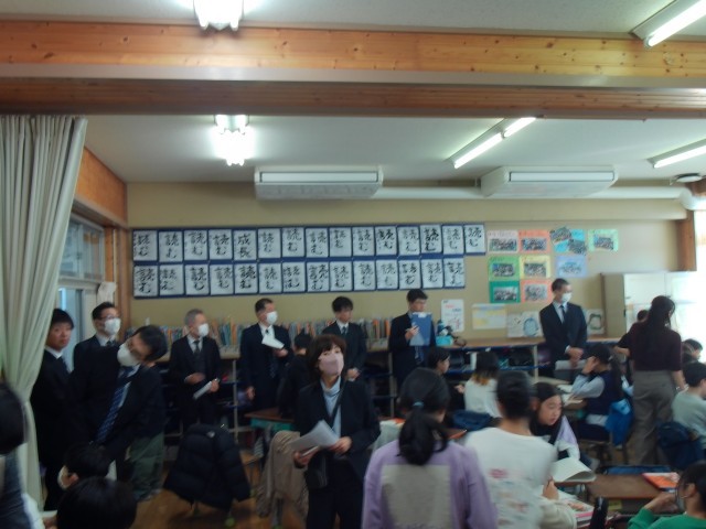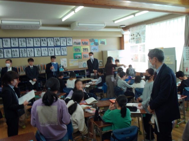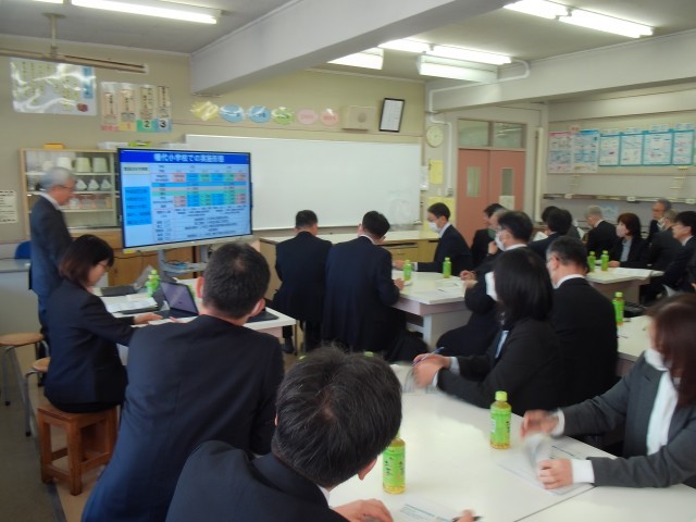 岩手県盛岡市立小学校の校長先生34名が来校され、本校で令和3年度から取り組んでいる教科担任制についての研修会を行いました。研修会では、5・6年生の授業を参観したあと、教科担任制の目的や運営の仕方、成果と課題などについて本校から説明を行いました。校長会の皆様は、本校の取組が大変参考になったと述べられ、さらに各学級の授業が児童の活気に満ちていることや、児童がよく挨拶してくれることについて、素晴らしいと感想を述べられていました。