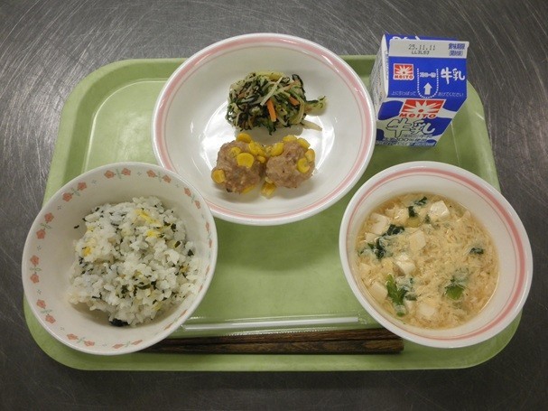 【献立】菊花入りわかめご飯、牛乳、とうもろこしの菊花蒸し、海苔のサラダ、かきたま汁