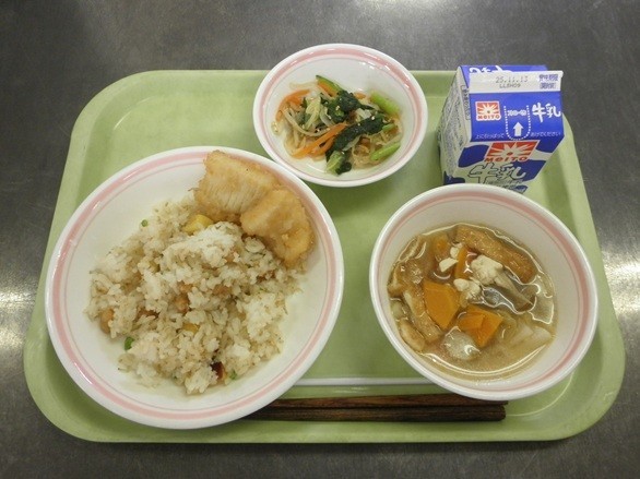 【献立】山坂達者飯、牛乳、いかの竜田揚げ、小松菜のあえもの、けんちん汁